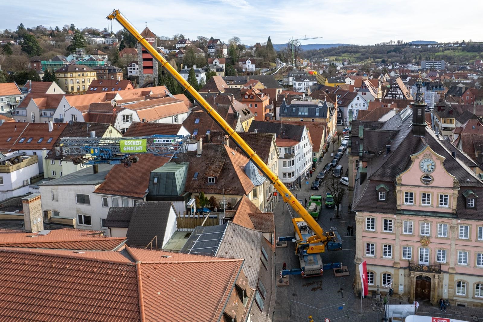 Selbst im geschäftigen Gmünd gibt es das nicht jeden Tag zu sehen: Ein schwerer Baukran "schwebt" über den Dächern der Altstadt – dank der Hilfe eines riesigen CT Autokrans aus dem umfangreichen Mietpool des Kranspezialisten aus Göppingen.