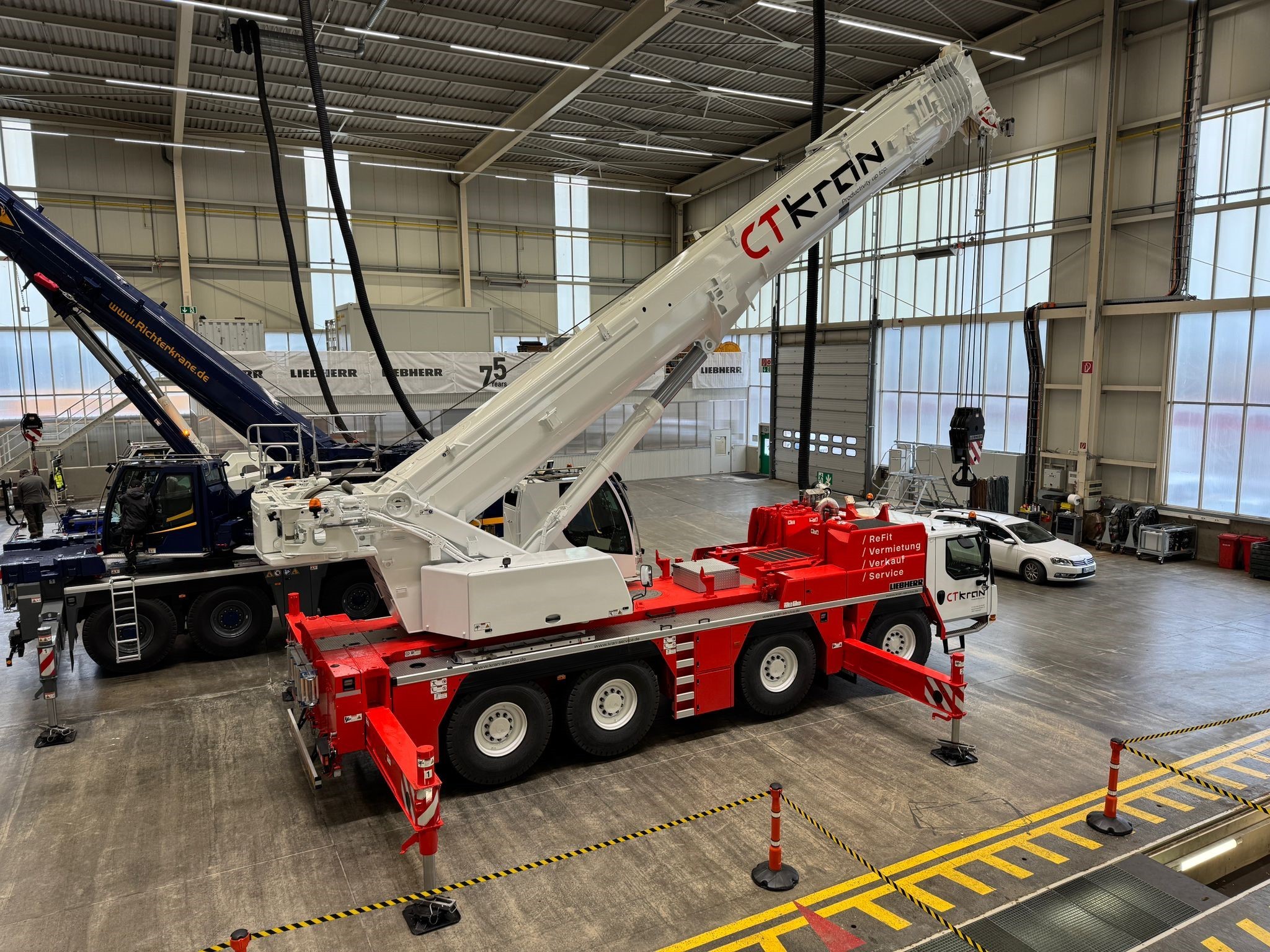 Nachdem vor 2 Wochen unser neuer 230to. Autokran vom Liebherr-Werk kam, wurde heute unser neuer Liebherr LTM 1120-4.1 aus dem Werk abgeholt. Damit besitzen wir nun den leistungsstärksten 4-Achs-Autokran und stoßen damit in eine Leistungsklasse vor, die bisher nur 5-Achsern vorbehalten war. Mit seiner maximalen Tragkraft von 120to., seinem 66m Mast und seinem Vario-Ballast lässt er uns nochmals flexibler bei Baustelleneinsätzen werden.